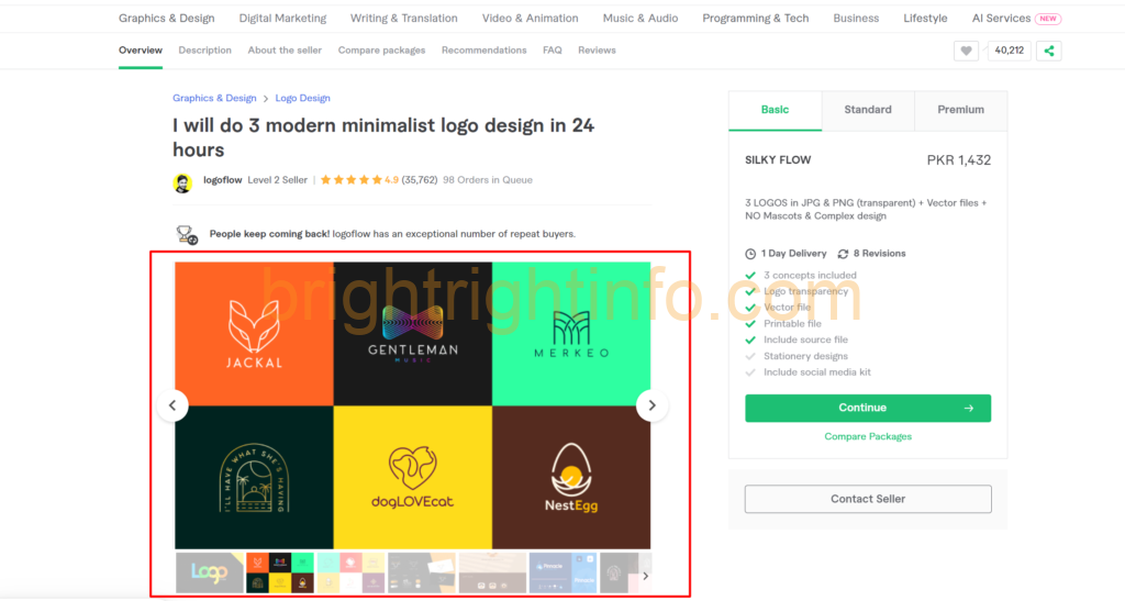 For example, in the below image, you can see this is the screenshot of the gig of a Fiverr seller who is offering logo design work. When I opened this gig, it is showing me a sample of his work which he has uploaded.