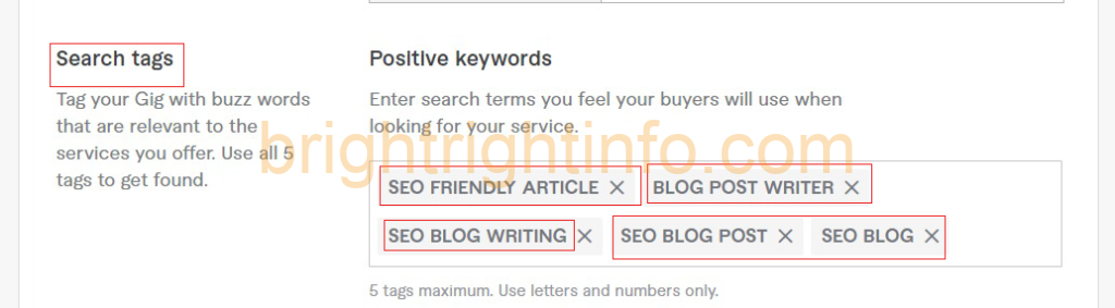You can add a maximum of 5 tags to your gig and make sure they are relevant to your service.